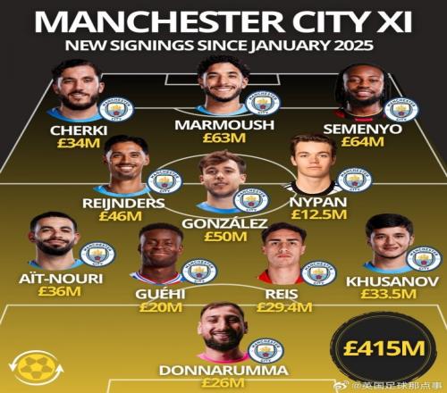 算上格伊,瓜迪奥拉在一年内已花费超4.15亿镑,打造全新首发11人